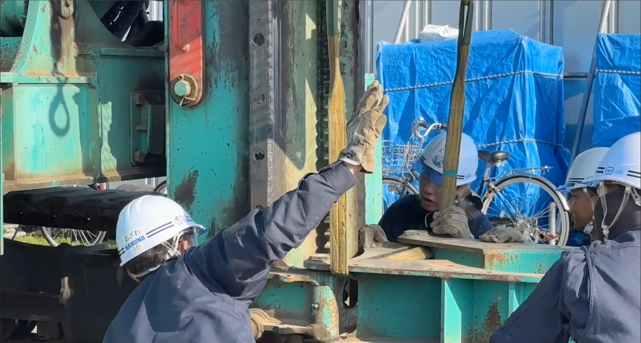 オペレーターは直接目視できないため、地上側が“合図の質”を上げないと、作業がスムーズに進みません。新人にとっては、技術だけでなく声かけ・タイミング・指示の出し方を学べる重要な工程です。
